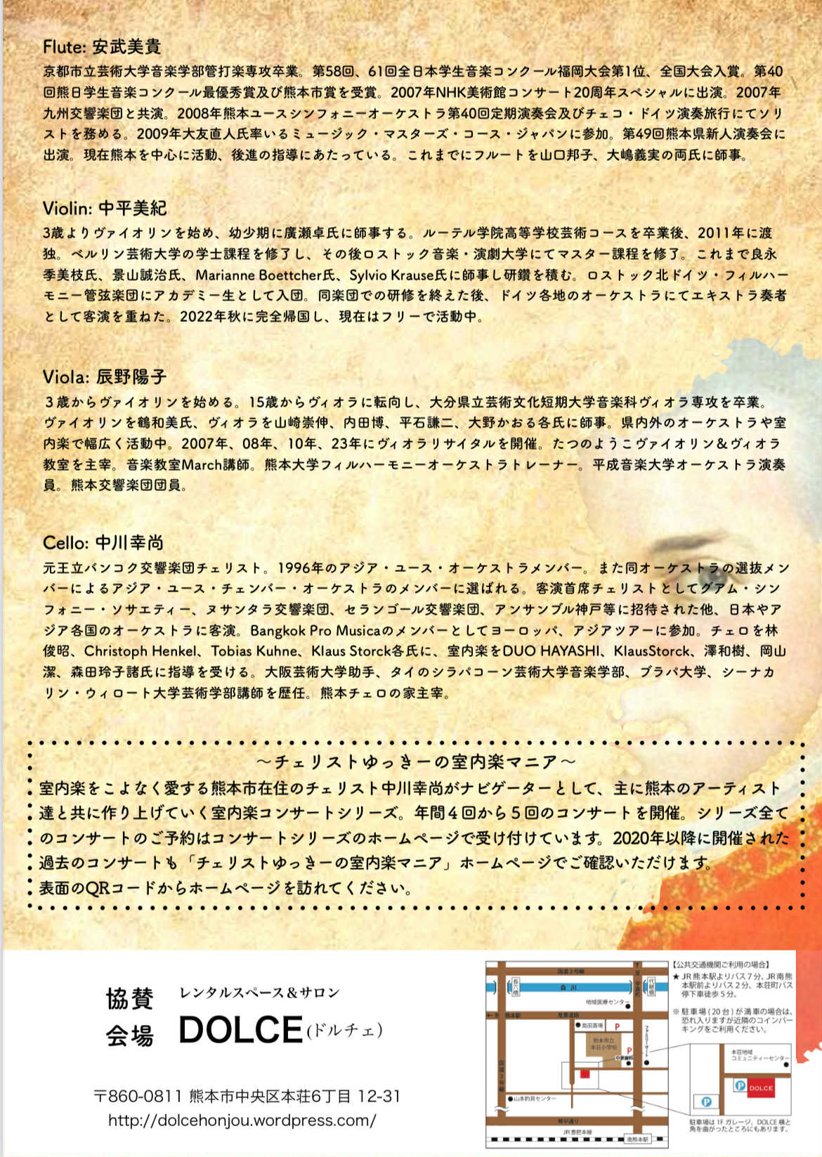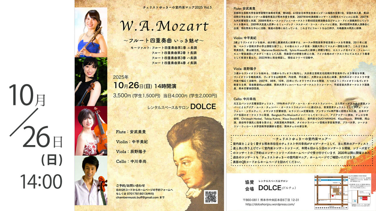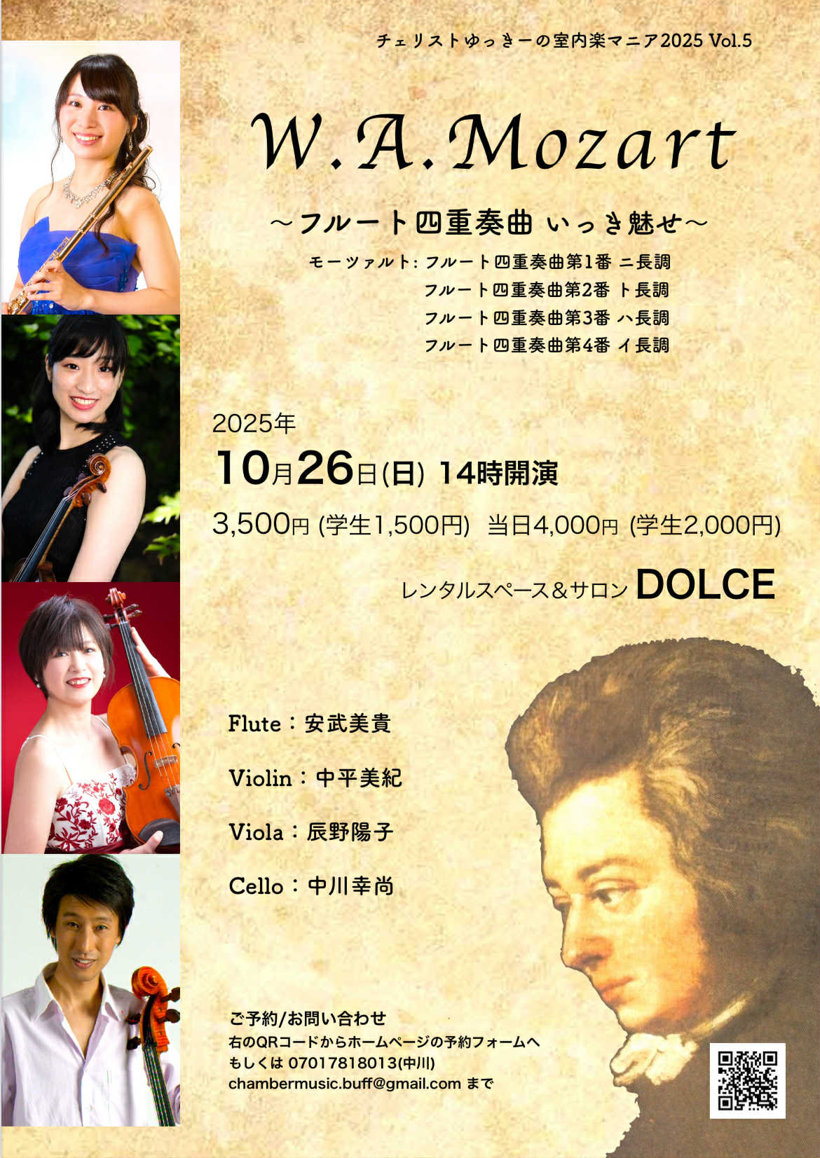 10月26日(日)にレンタルスペース&サロン DOLCE にて チェリストゆっきーの室内楽マニア2025 Vol.5 W.A.Mozart〜フルート四重奏曲いっき魅せ〜 が開催される予定です!