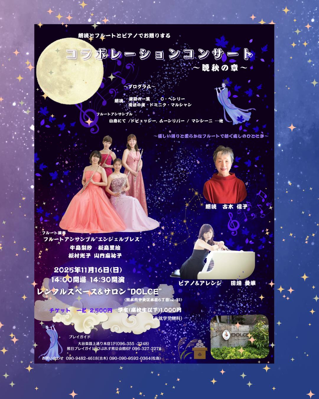 11月16日(日)にレンタルスペース&サロン DOLCE にて 朗読とフルートとピアノでお贈りするコラボレーションコンサート〜晩秋の章〜 が開催される予定です!