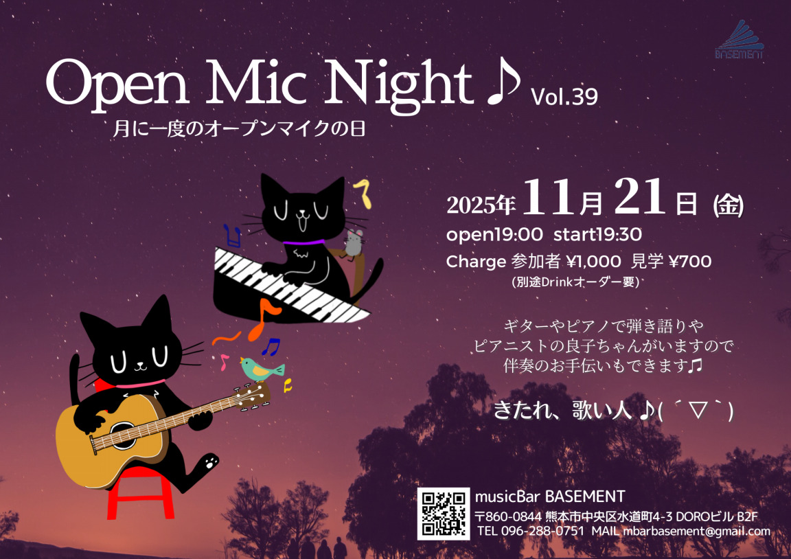 11月21日(金)にmusicBar BASEMENT にて Open Mic Night vol.39 が開催される予定です!