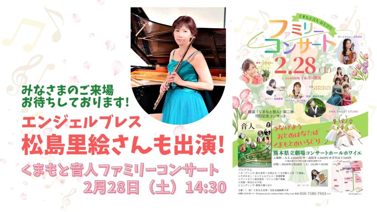 2026年2月28日のお昼の14時30分から、”くまもと音人(おとびと)ファミリーコンサート” が、熊本県立劇場のホワイエで開催されます!