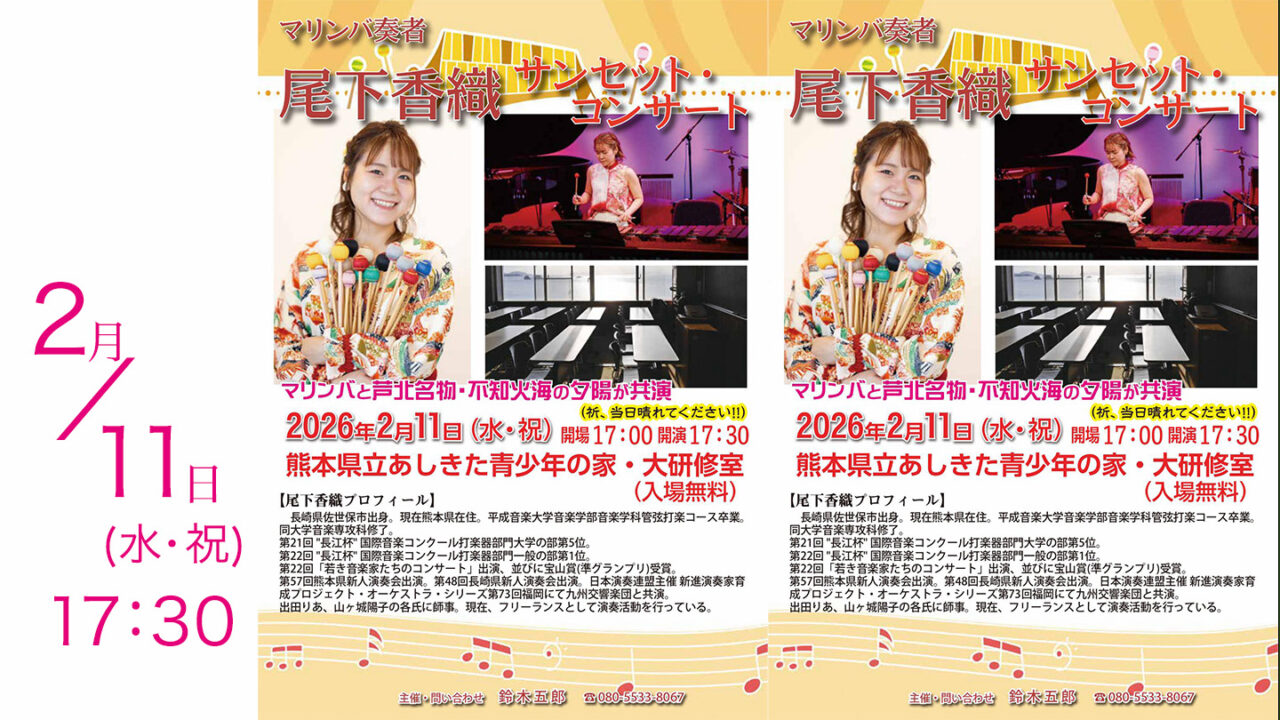 2月11日(水・祝)に、熊本県立あしきた青少年の家 にて 尾下香織 サンセット・コンサート が開催される予定です!
