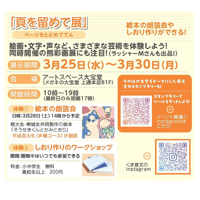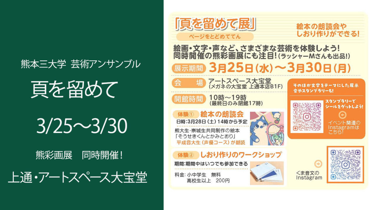 2026年3月25日(水)~3月30日(月)に、上通のアートスペース大宝堂(メガネの大宝堂上通本店地下1階)にて、熊本三大学芸術アンサンブル 『ページを留めて』展が、間もなく開催されます!