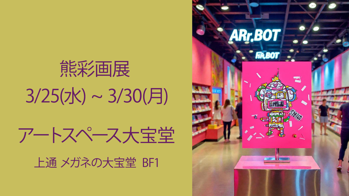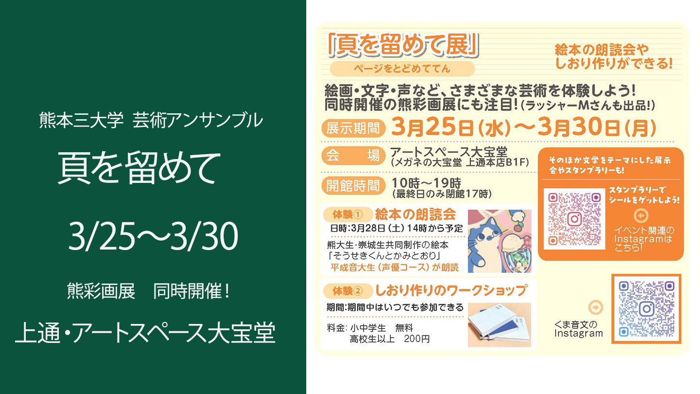 そして、2026年3月25日(水)~3月30日(月)に、上通のアートスペース大宝堂(メガネの大宝堂上通本店地下1階)にて、熊彩画展 と 熊本三大学芸術アンサンブル 『ページを留めて』展が同時開催されます。